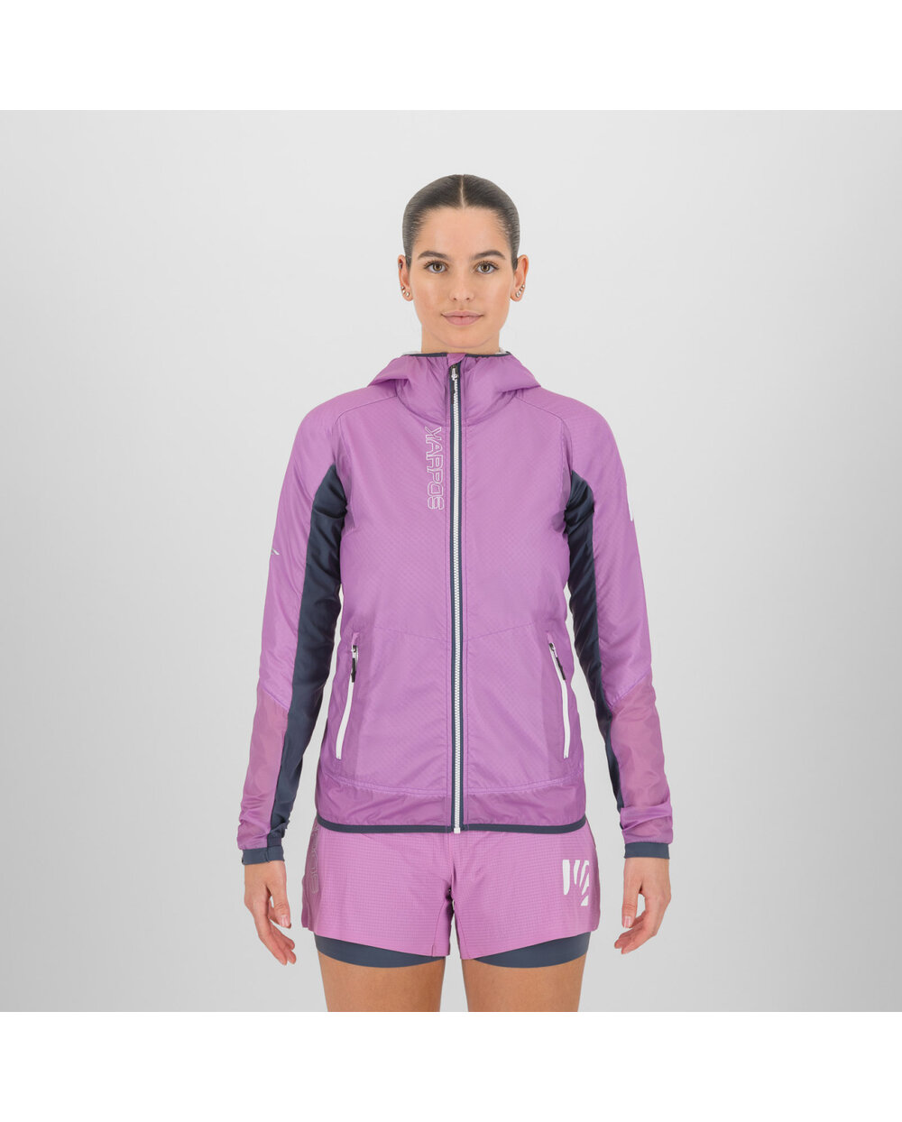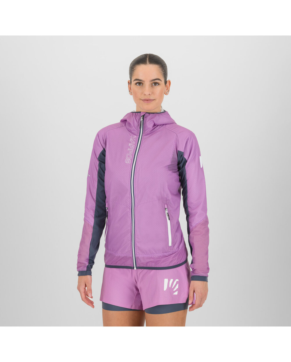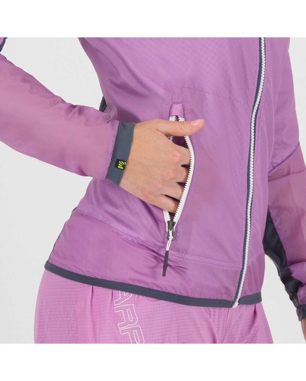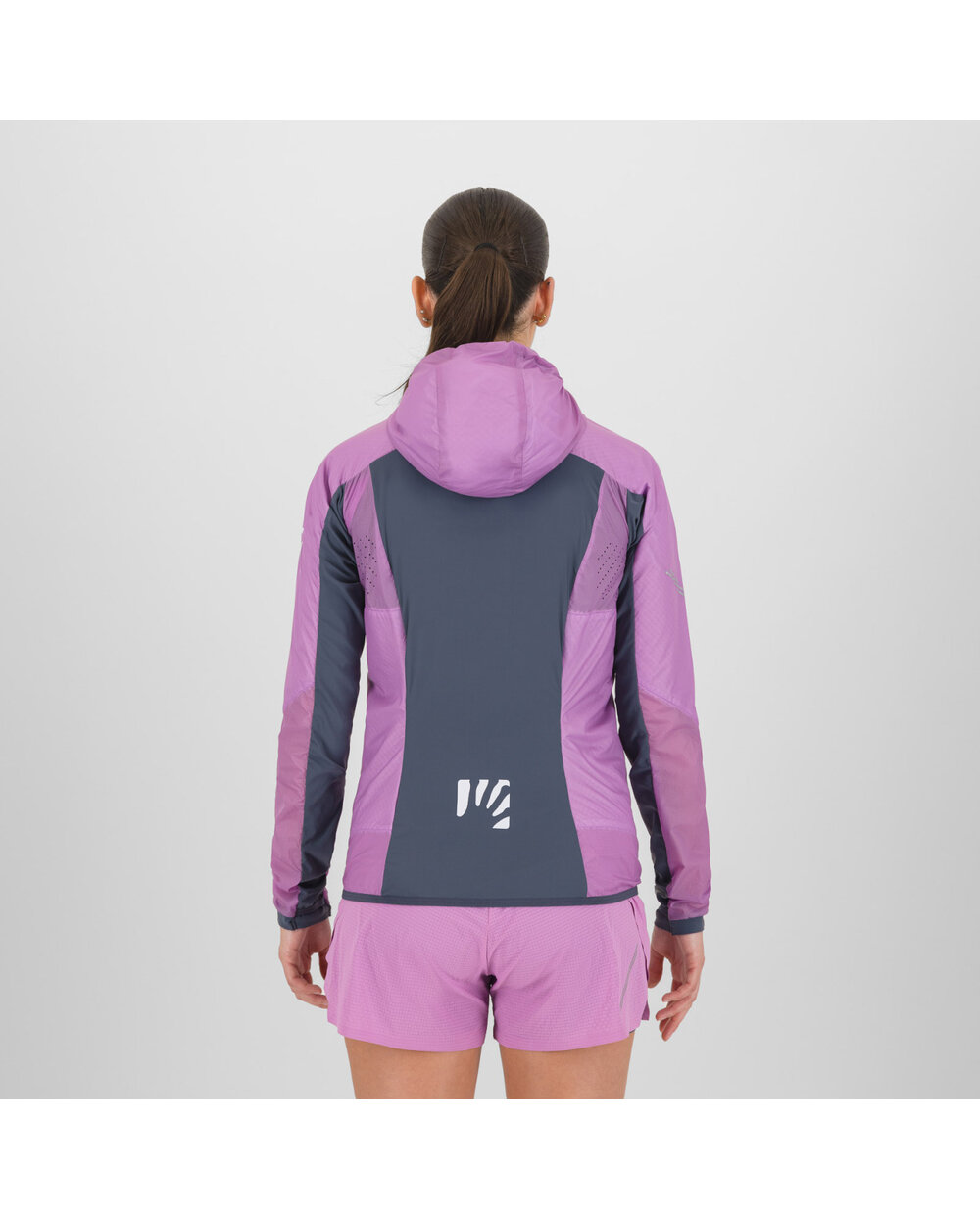 Hybridkonstruktion – Winddichtes Polyamid auf der Vorderseite verhindert das Entweichen von Körperwärme, während atmungsaktives elastisches Material auf der Rückseite Überhitzung verhindert.