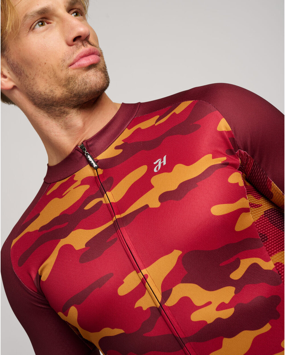Es besteht aus einem haltbareren Stretchmaterial in Kombination mit hoch atmungsaktivem Mesh-Material an den Seiten für die Schweißableitung. Sie ist mit einer klassischen Dreifachtasche und einer Sicherheitstasche mit Reißverschluss ausgestattet. Am unteren Umfang des Trikots und der Ärmel befinden sich Anti-Rutsch-Enden. Das Design des Trikots wird durch ein Tarnmuster ergänzt, das seinen natürlichen Charakter unterstreicht.