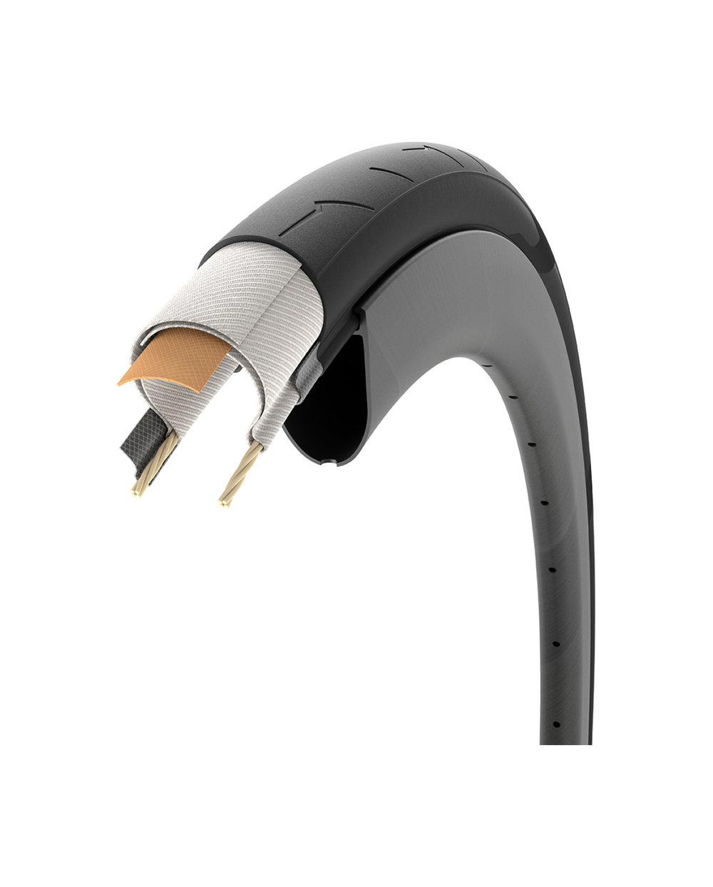 Hochleistungs-Geflechtstruktur mit einer zusätzlichen Lage aus schnittfestem Hochleistungsgewebe unter der Lauffläche, die dem Reifen unter verschiedensten Bedingungen eine überragende Pannensicherheit verleiht. Die Kombination aus dieser Lage und den Skelettlagen des Geflechts ermöglicht es, die effektivsten Rollwiderstands- und Gewichtsparameter für diese Struktur für die Verwendung mit dem Schlauch zu erreichen.