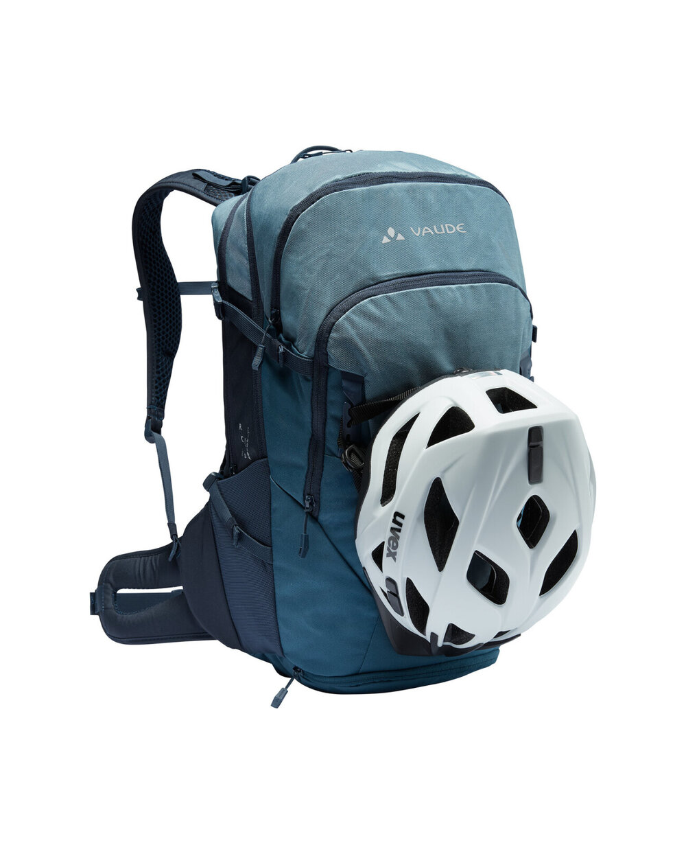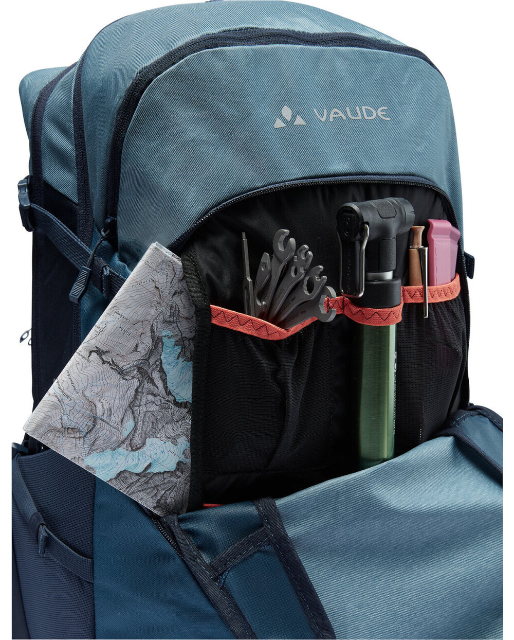 - Vordere untere Kammer, obere Tasche mit Mesh-Organizer, großes vorderes Fach getrennt von kleineren, seitlichen Stretchfächern, Helmhalter, Licht und auch Regenmantel enthalten Verwendete Materialien