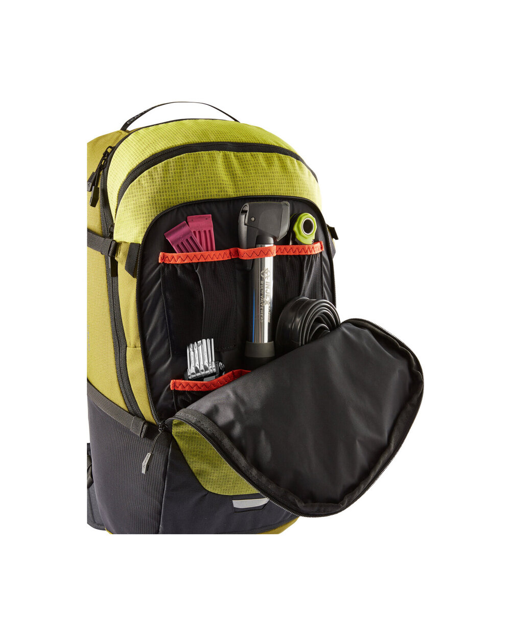 - Vor dem Hauptfach befindet sich eine Innentasche mit Reißverschluss, Werkzeugfach, Helmhalter, rechter Flügel des Lendengurts, Augenstretchtaschen, separates Fach für Feuchtigkeitscreme, Kompressionsriemen an den Seiten, Sonnenbrillenband, Regenmantel im separaten unteren Fach und Reflex