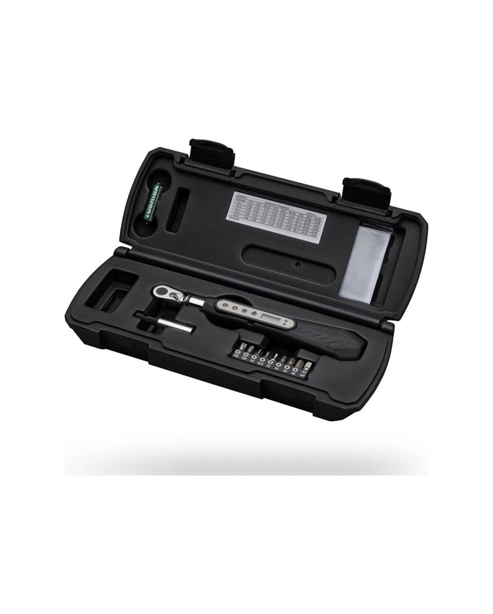 Präzisions-Drehmomentschlüssel mit LCD-Anzeige. Nahezu alle für das Radfahren benötigten Drehmomente können eingestellt werden. Optische und akustische Signalisierung für eine sichere Einstellung. Einstellbare Werte: N-m, ft-lb, in-lb, kg-cm. Auswechselbare Batterien. Lieferumfang: Hartschalenkoffer, Aufsätze: M2, M2,5, M3, M4, M5, M6, T20, T25 und 1/4"-Adapter.