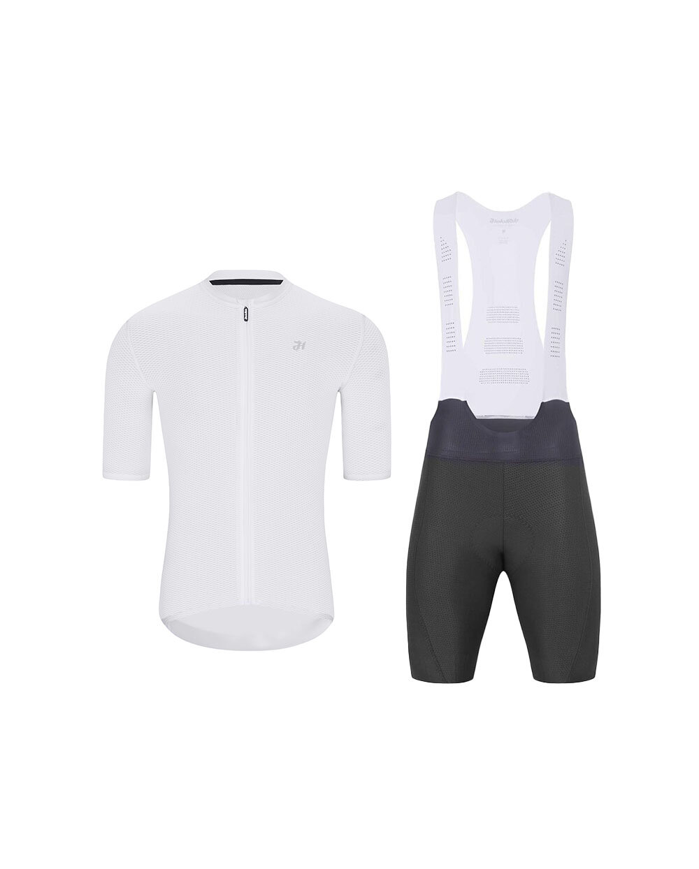 Dieses Set kombiniert das leichte und besonders atmungsaktive HOLOKOLO AEROLITE-Radtrikot in Weiß mit den technisch ausgefeilten HOLOKOLO NOVEL PRO-Radhosen mit Trägern in Anthrazit. Zusammen bilden sie die ideale Kombination für Radfahrer, die hohe Leistung, Komfort und einen klaren, modernen Look beim Training und auf langen Touren suchen.